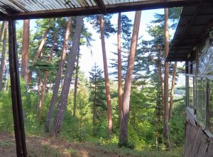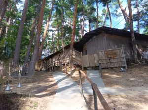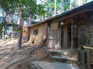 山の中を進むと、アカマツ林の中に佇む木造の松茸小屋が現れます。
